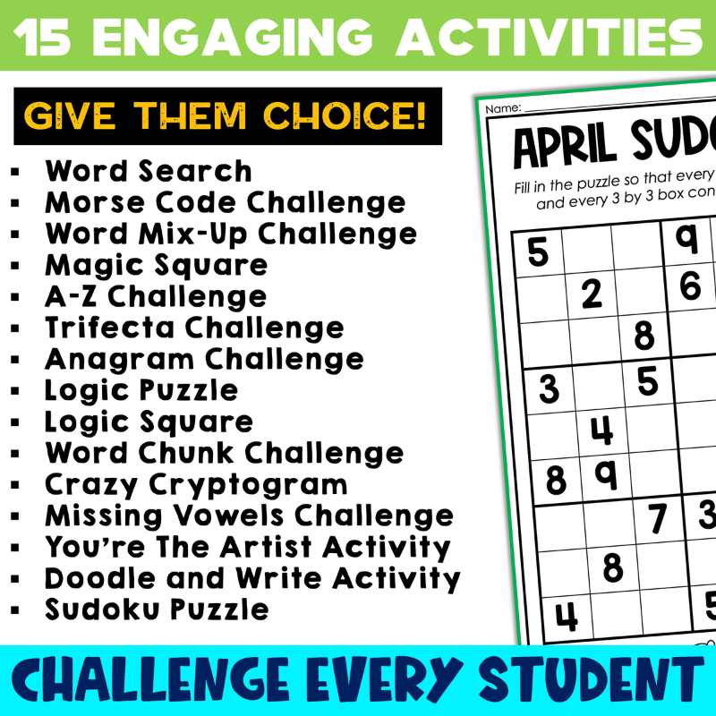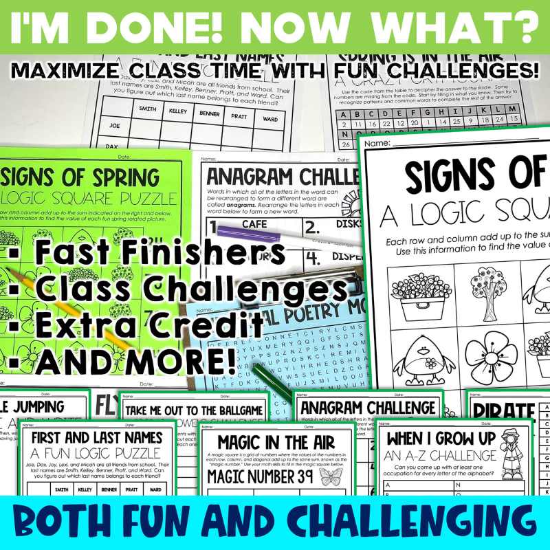 Are you tired of hearing your students say, “I’m done, what now?” Well, we’ve got you covered with our April and Spring themed fast finishers activities and puzzles! Keep your students engaged and excited with our go-to resource that includes 15 different activities and challenges. From word searches to mazes and everything in between, you’ll find a variety of activities that will keep your students entertained all month long. Don’t let boredom take over your classroom – grab this puzzle pack today and watch your students thrive!