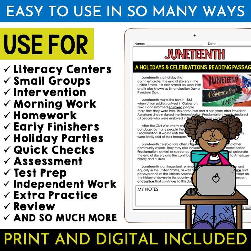 This print and digital Juneteenth reading comprehension passage is a great way to maintain the rigor in your classroom while celebrating this important day. Designed specifically for 3rd-5th students, this reading passage is a great way to give your students opportunities to practice their reading comprehension skills, while gaining valuable knowledge about this important holiday.