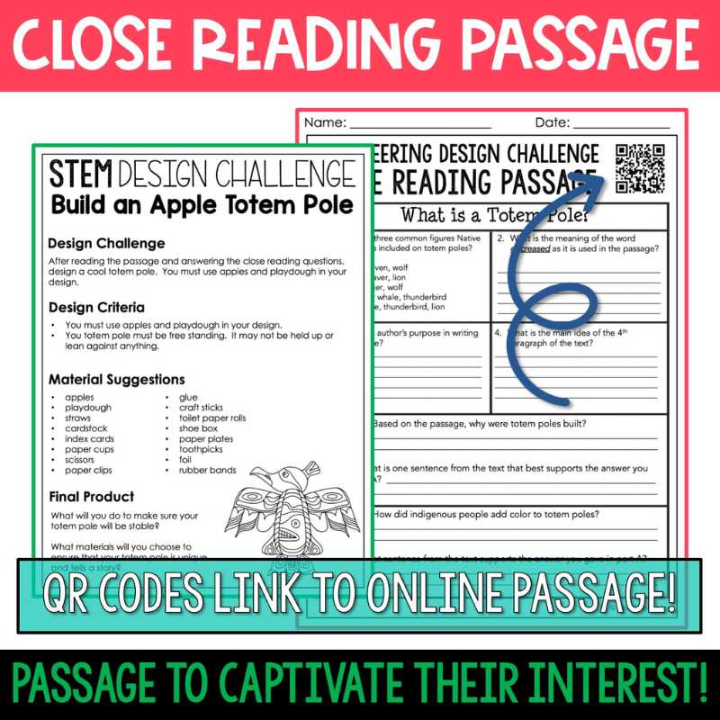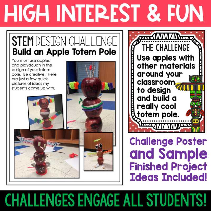 STEM challenge activities are so much fun. But, finding the time to incorporate design challenges into your curriculum can be difficult. The Apple Totem Pole Design Challenge is part of the STEM with close reading series. It seamlessly allows you to tie together the curriculum by giving you rigorous text dependent questions that go with a high interest online reading passage in addition to the fun STEM activity! Soar to new heights when you put your thinking cap on and let the STEM adventure begin!