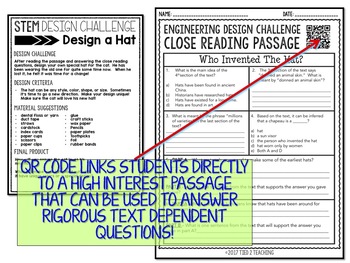 STEM challenge activities are so much fun. But, finding the time to incorporate design challenges into your curriculum can be difficult. The New Hat for Cat Design Challenge is part of the STEM with CLOSE READING series. It seamlessly allows you to tie together the curriculum by giving you rigorous text dependent questions that go with a high interest reading passage IN ADDITION to the fun STEM activity! Design a hat for the cat! Put your thinking cap on and let the STEM adventure begin!