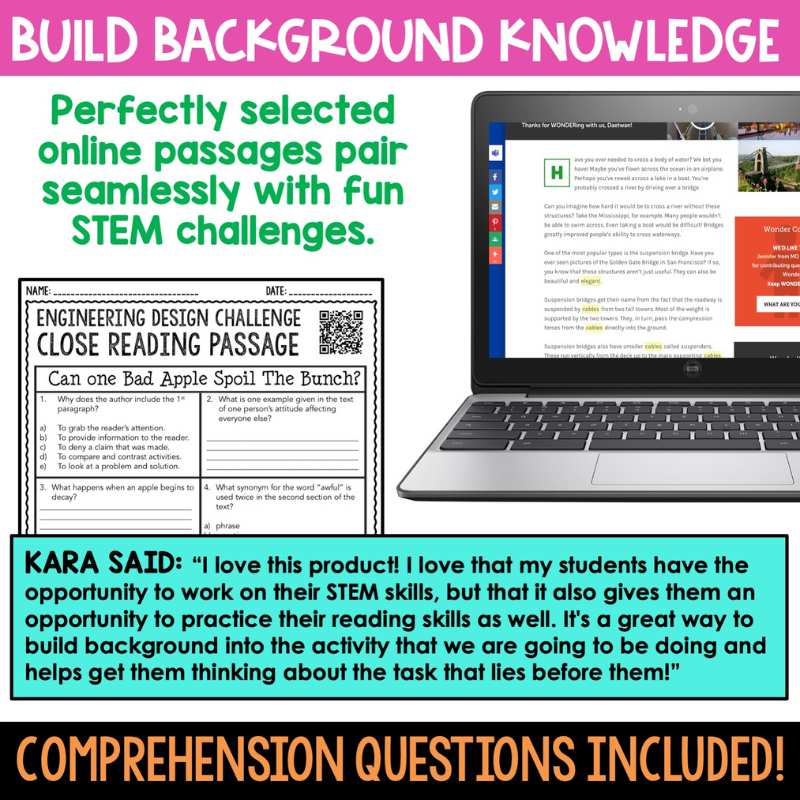 Integrating ELA into your STEM challenges has never been easier or more relevant. Use the close reading passages and questions to get the kids pumped up for each challenge you present them with!