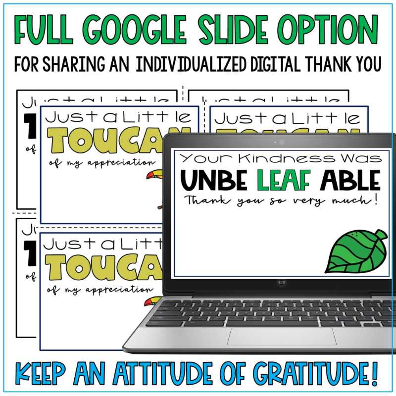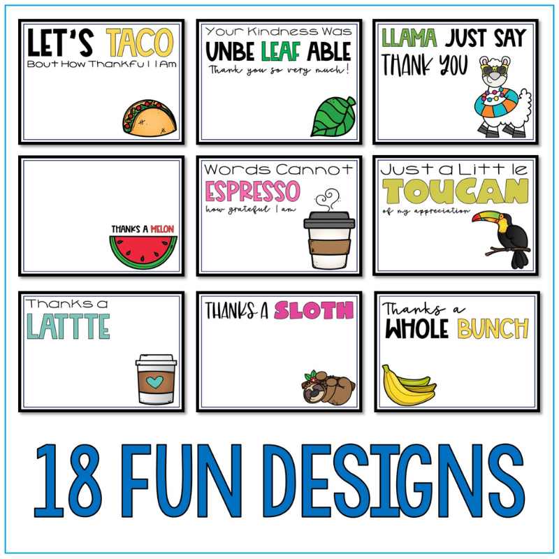 Included you will receive 18 different pun-filled thank you note designs. Each design comes in BOTH color AND black and white for easy printing. In addition, I have included each of the 18 notes as a FULL PAGE GOOGLE SLIDE so that you can easily share a personalized digital thank-you if you prefer this option.